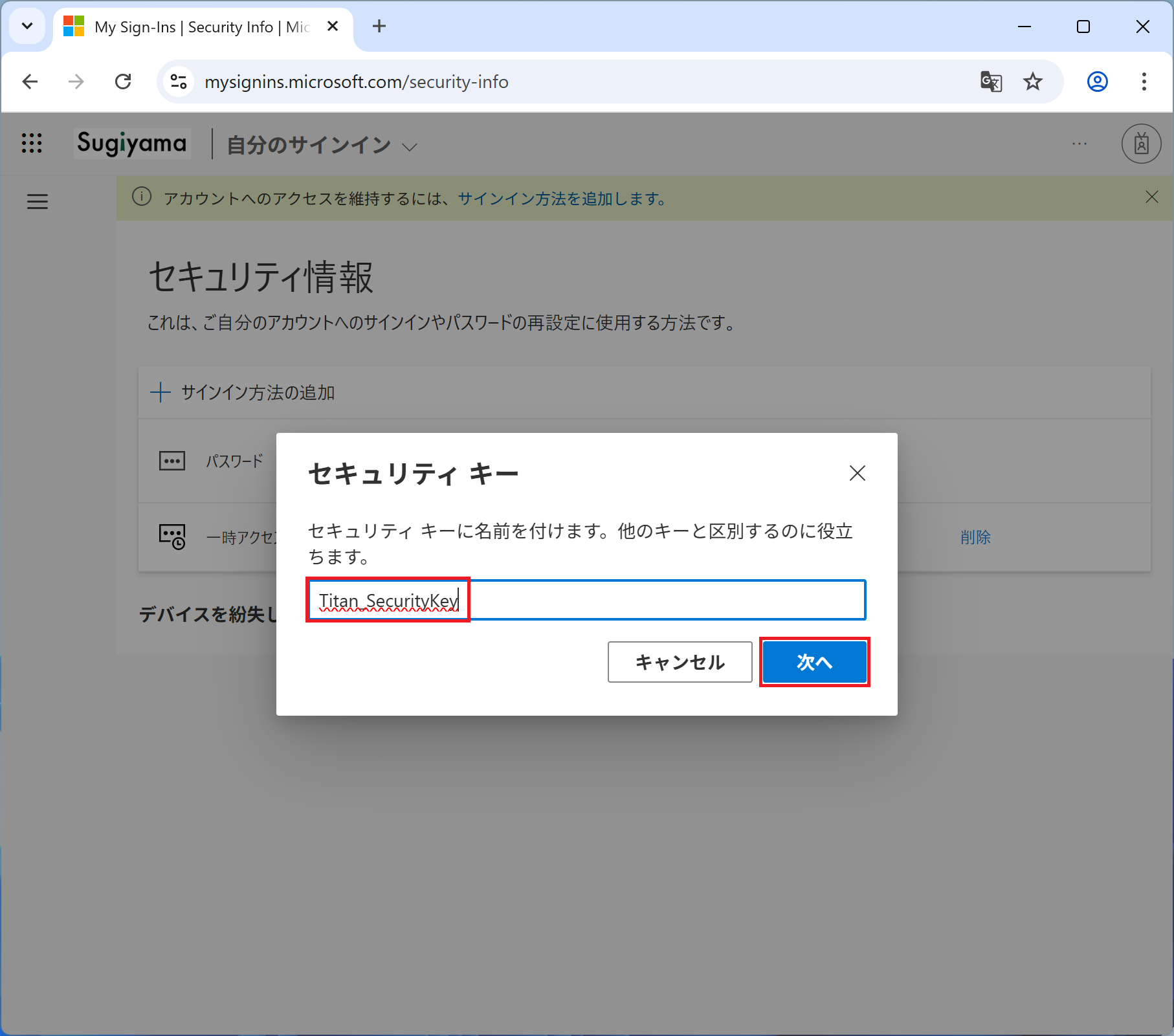 操作: セキュリティ キーを見分けるため、任意の名前を入力し、次へを選択(クリック)